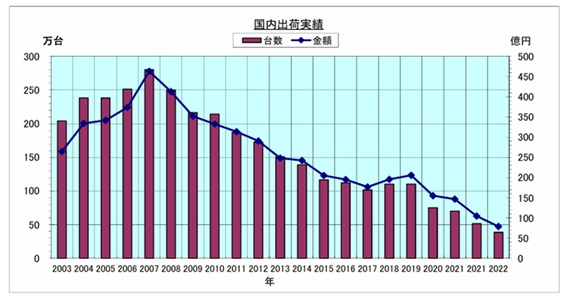 2007年の280万台463億円をピークに、2022年は38万台78億円まで数字を下げています。JBMIA統計委員会による「事務機械の2024年会員企業の出荷実績」を参照すると、2024年ではさらに28万台57億円まで落ち込んでいますね。昨年2月(JEPAレファレンス委員会活動休止報告の前週!)に、カシオ計算機が電子辞書の新規開発中止を発表してニュースになりましたが、市場の急速な縮小がその理由として挙げられていました。スマホの普及(2008年~)や教育現場でのPC・タブレット利用の拡大(2020年~)などが、(電子辞書の)市場の縮小に拍車をかけたとされています。