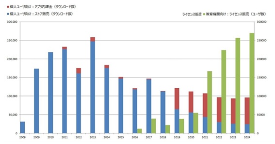 2021年以降のGIGAスクールを背景としたライセンス販売数(緑色)の伸びは、このグラフの中では救いです。ちなみに、2020~2024年の電子辞書国内出荷台数の減少は47万台で、その間の教育機関向けのライセンス発行数の増大は21.5万。微妙。電子辞書の市場縮小の一因ではあるでしょうが、やっぱり根本的な原因は他にあるような気がします。そして、GIGA端末の配布・稼働数に対してライセンス発行数≒ユニークユーザ数(27万)はまだまだ少なく、教育現場での辞書コンテンツニーズの低さが懸念されます。学生ユーザは無料の辞書アプリに流れているのではないか? いや、そもそも辞書を引かなくなっているのではないか? 紙の辞書に回帰している?…うん、それはなさそう。
